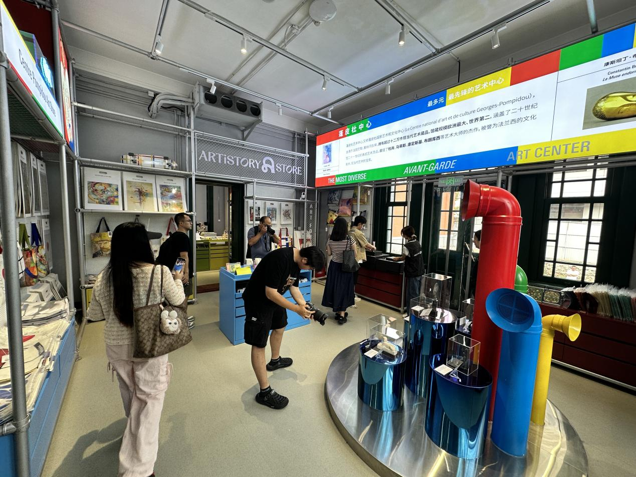 在項(xiàng)目負(fù)責(zé)人的講解帶領(lǐng)下,媒體記者參觀了文創(chuàng)旗艦店、IP主題餐飲、美育工坊、六大主題展等內(nèi)容。主題零售區(qū)域以蓬皮杜中心的鋼架矩陣與管道結(jié)構(gòu)為設(shè)計(jì)靈感,提供獨(dú)家藝術(shù)衍生品,讓觀眾帶走可收藏的城市記憶;藝術(shù)展陳裝置以館藏杰作為靈感,設(shè)置互動(dòng)體驗(yàn)區(qū),引領(lǐng)觀眾走進(jìn)大師構(gòu)建的藝術(shù)時(shí)空;閱讀與藝術(shù)活動(dòng)共創(chuàng)區(qū),實(shí)現(xiàn)“可逛、可玩、可學(xué)、可買”的多元體驗(yàn)。首展《天才的『綺』跡:從野獸派到包豪斯的色彩盛宴》所展示的“法國博物館聯(lián)盟”所藏真跡藝術(shù)品引起了記者們的特別關(guān)注,讓觀者感受百年商埠更新勢能與全球頂級(jí)藝術(shù)IP的巧妙對(duì)話,見證工業(yè)美學(xué)與意大利文藝復(fù)興風(fēng)格建筑交融共生的藝術(shù)盛宴。